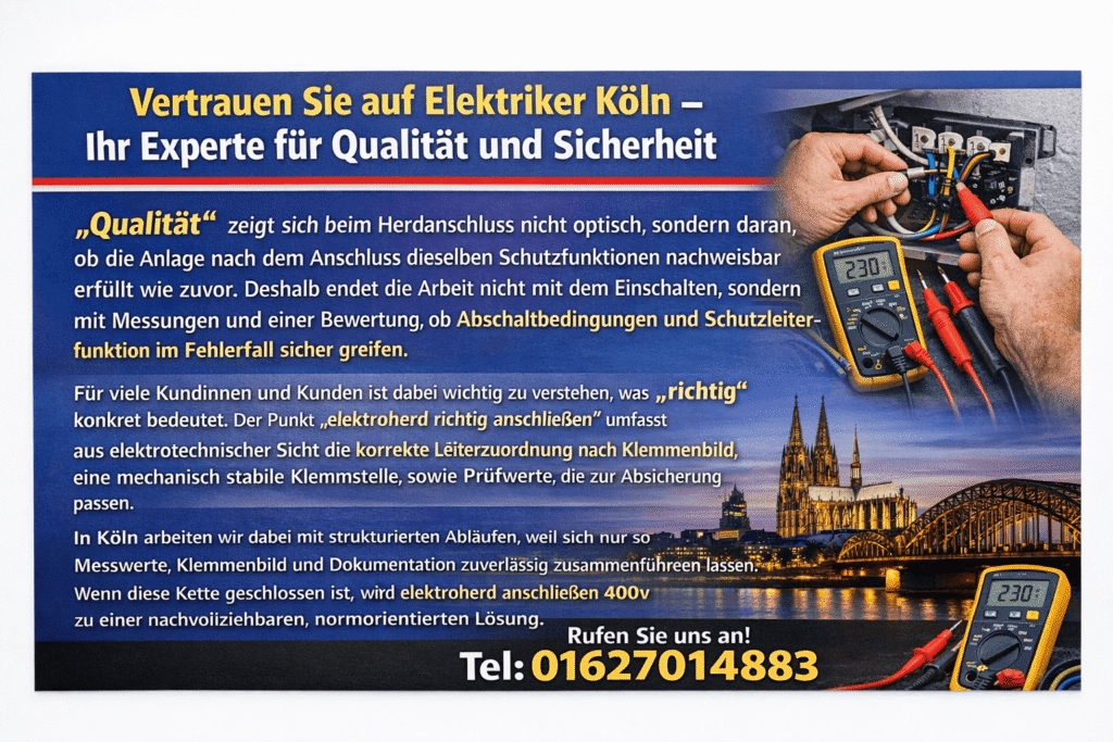 In Köln arbeiten wir dabei mit strukturierten Abläufen, weil sich nur so Messwerte, Klemmenbild und Dokumentation zuverlässig zusammenführen lassen. Wenn diese Kette geschlossen ist, wird elektroherd anschließen 400v zu einer nachvollziehbaren, normorientierten Lösung. Aus fachlicher Sicht zeigt sich, dass eine strukturierte Umsetzung durch Elektriker Köln hier den zuverlässigsten Rahmen bietet.