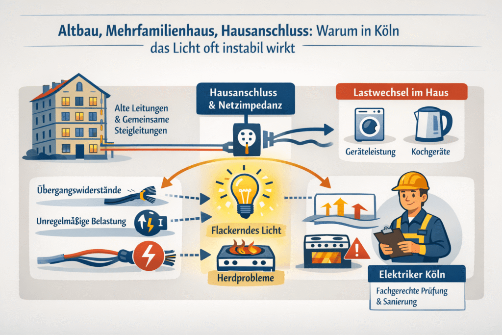 In Kölner Altbauten und Mehrfamilienhäusern treffen alte Leitungsanlagen, nachträgliche Umbauten und gemeinsam genutzte Steigleitungen auf heutige Geräteleistungen. Dadurch entstehen häufig Übergangswiderstände an Klemmstellen oder eine ungleichmäßige Belastung der Außenleiter, was sich zuerst an der Beleuchtung zeigt.