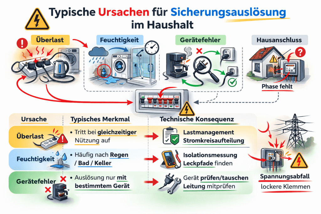 Typische Ursachen im Haushalt: Überlast, Feuchtigkeit, Gerätefehler oder Probleme am Hausanschluss